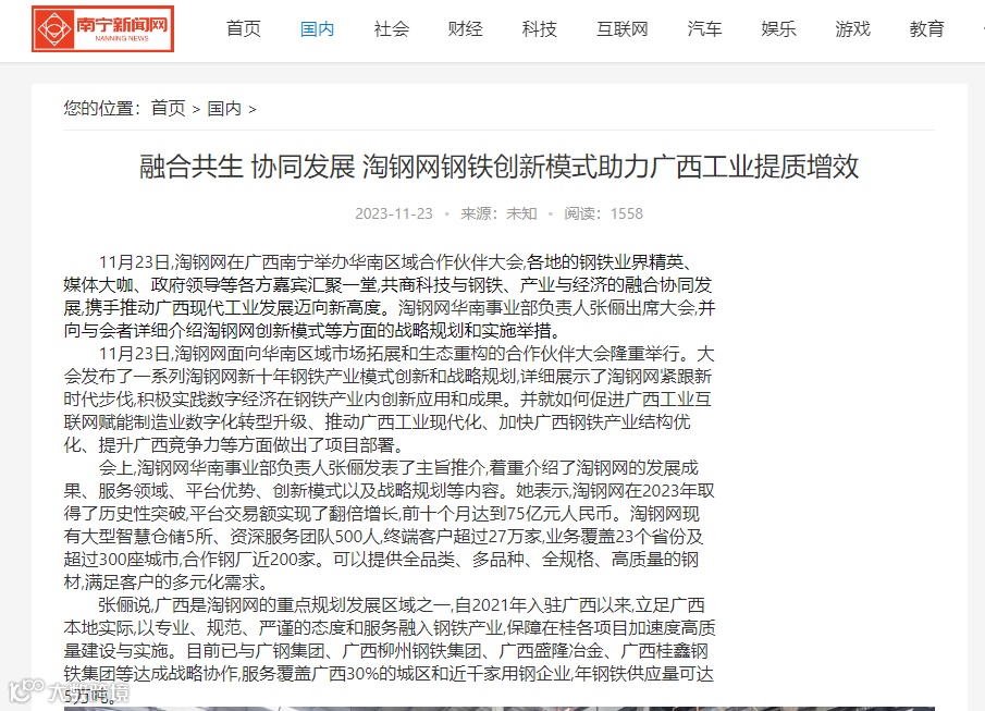南宁新闻网刊文 | 淘钢网钢铁创新模式助力广西工业提质增效