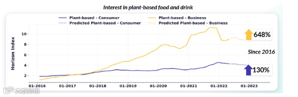据Spoonshot的数据统计,自2016年以来,商家对于植物基食品的兴趣上升了648%,消费者对此的兴趣也上升130%。