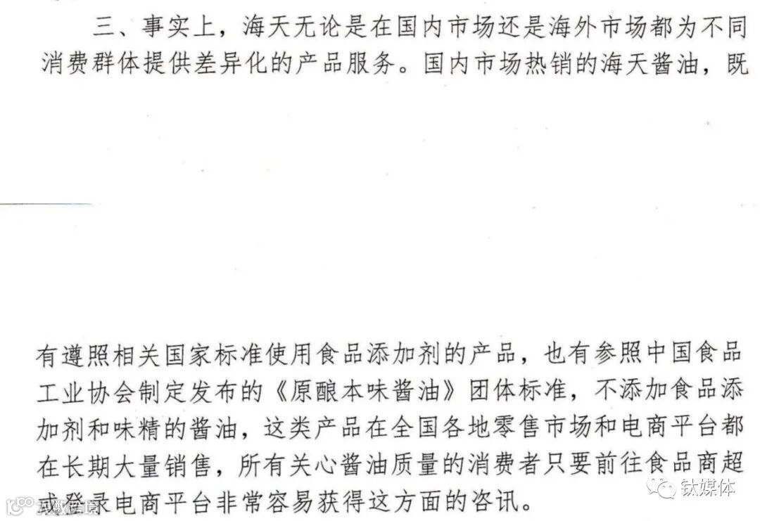 至于添加食品添加剂生产的酱油优劣,海天味业在声明中表示:“食品添加剂广泛应用于世界各国的食品制造中,世界各国的正规食品企业都会依据法规标准和产品特性,合法合规使用食品添加剂,并且按规定标识清楚。简单认为国外产品的食品添加剂少,或者认为有添加剂的产品不好,都是误解。”其还称,海天产品的内控标准要求大多都高于甚至远高于国家标准,同一品质的产品,国内国际的内控标准都一致。