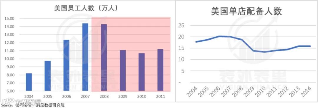 可以看到,2009年星巴克的门店员工减员接近3.2万,单店配备人数从20人降到了14人左右。