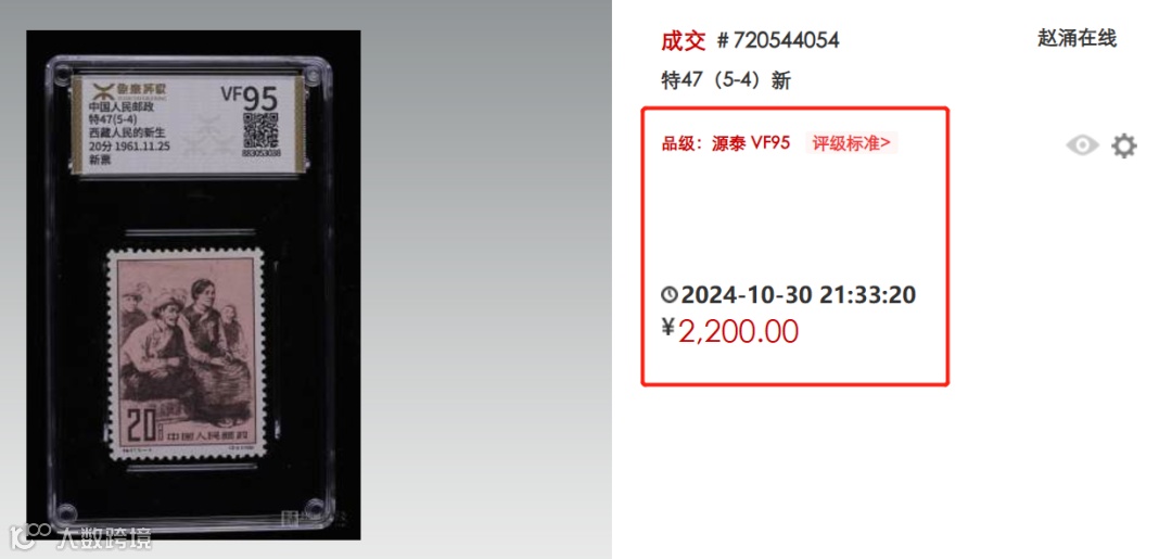特47(5-5)新票近期在赵涌在线没有源泰全品(VF)95出现,但是有一枚源泰全品(VF)96分的,也可以作为参考: