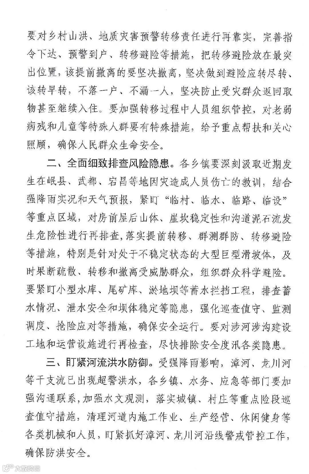 请各乡镇、各有关部门按照各自职责,注意防范强降水引发的中小河流洪水、山洪、崩塌、地质灾害和城乡积涝,确保人民群众生命财产安全。