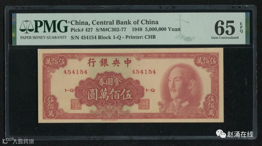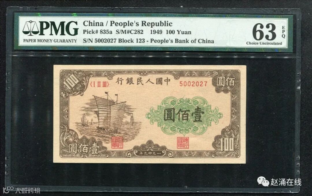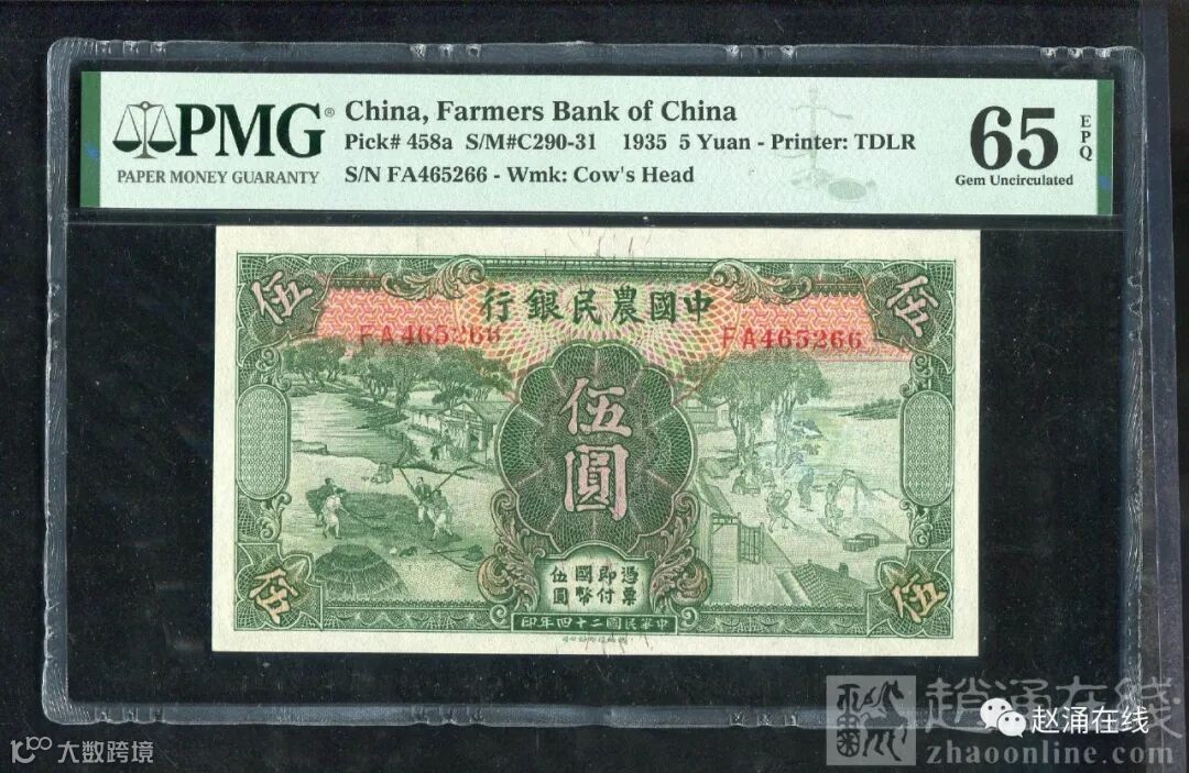 农行五元这枚图案精美,印刷上乘,但存世多为差品,好品少见,本场这枚已属绝佳品相,7,659元成交。