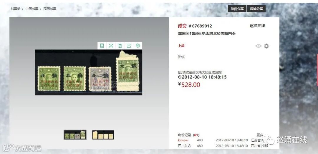 另外,笔者在2012年8月10日晚18:48:15,在赵涌在线竞拍得发行于1942年的华北纪2邮票中加盖“苏北”邮票一组四枚,其中含伦敦版单圈孙像加盖礼票一枚,得标价格528元(含购买佣金)(图12—图14)。
