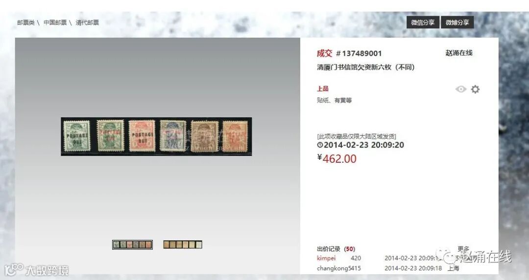 总计竞拍费用约1100元。而在淘宝网上,某邮社对该套邮票的黑色加盖欠资六枚票的报价就高达9000元(图8),通过循序渐进的方法着实捡了个大漏。