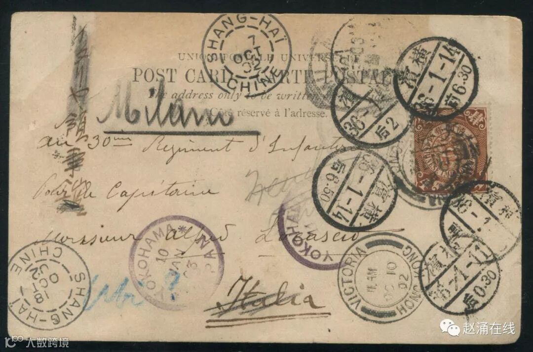 1902年天津寄意大利明信片一件、贴清蟠龙4分一枚、销双戳、上海、香港、横滨中转戳