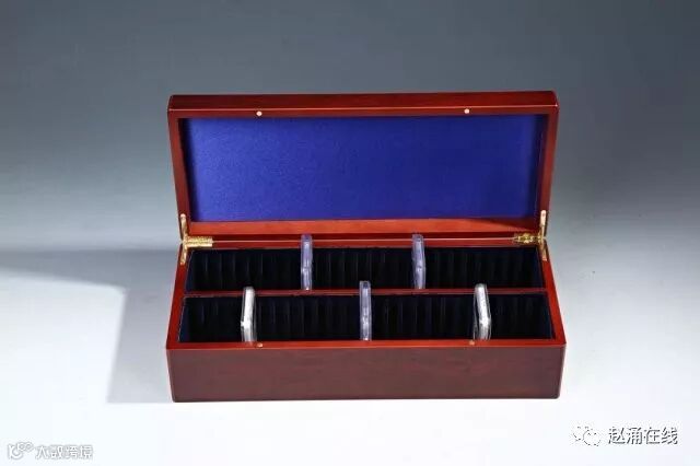 灯塔双排评级币木盒系列,整体尺寸374*158*98mm。木盒材质为优质桃花心木,内衬深蓝色丝绒底,此款木盒可放置50枚鉴定币。
