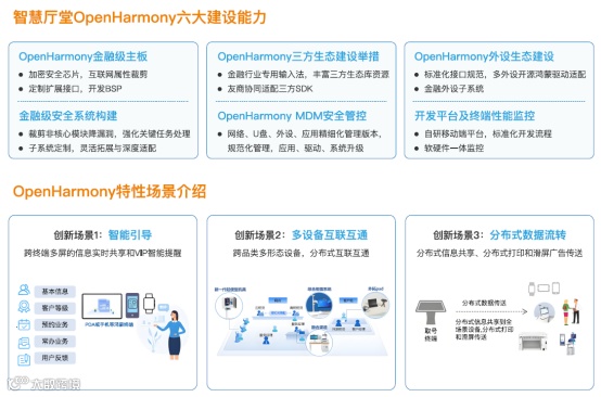 该智慧厅堂一体化解决方案覆盖柜面业务、非现自助业务、融合渠道和移动外拓等多个场景,借助OpenHarmony 分布式软总线、分布式数据管理、分布式任务调度等技术,实现了 OpenHarmony 开发者手机和智慧厅堂实体设备四屏间(四屏异显)的互联互通。例如,在智能引导场景中,通过跨终端多屏的信息实时共享,能够实现 VIP 智能提醒,为客户提供更贴心的服务;在多设备互联互通场景下,跨品类多形态设备可实现分布式互联互通,提升设备协同工作效率;分布式数据流转场景则实现了分布式信息共享、分布式打印和滑屏广告传送,优化客户体验与厅堂营销效果。