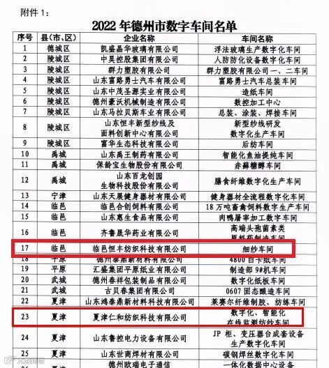 近日,德州市工业和信息化局发布了《关于公布2022年度德州市数字车间、智能工厂名单的通知》,夏津仁和纺织数字化、智能化在线监测纺纱车间和临邑恒丰纺织细纱车间双双荣获德州市数字车间称号。