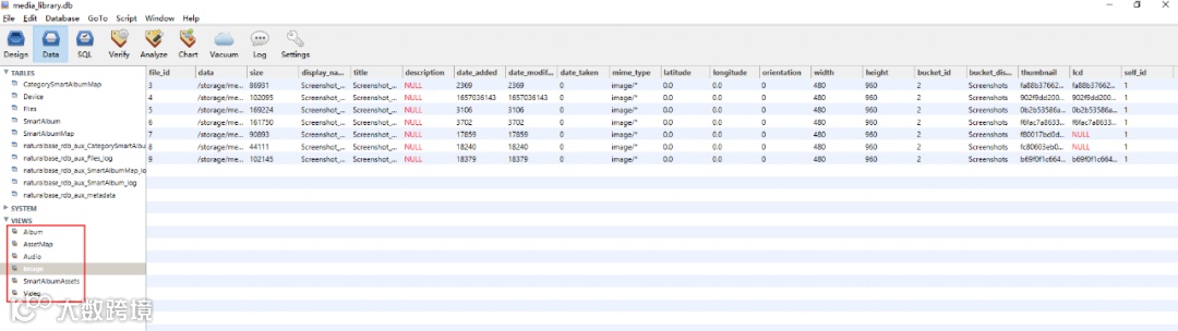 媒体库操作的数据是在/data/app/el2/100/database/com.ohos.medialibrary.medialibrarydata/media_library.db目录下。这是SQLite3数据库的文件,可以使用SqliteManager软件打开,主要看数据库的两部分: