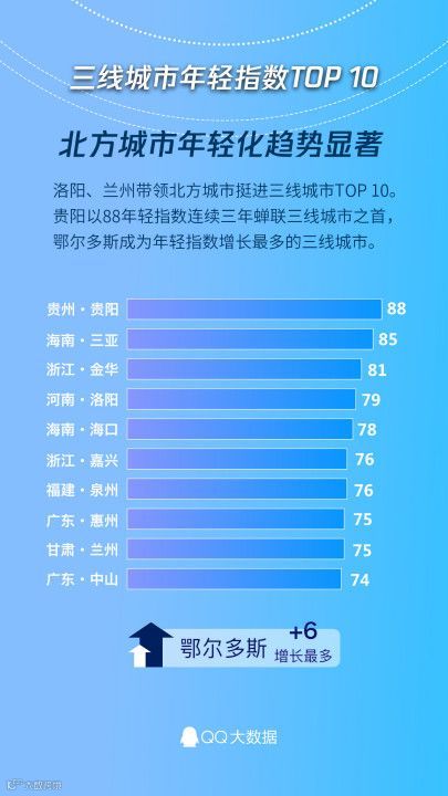 贵阳市以88的年轻指数连续三年蝉联三线城市首位,同时今年也成为全国“最年轻城市”。三亚市以年轻指数85排名第二,金华市排名第三为81。三线城市中,内蒙古鄂尔多斯市年轻指数较去年增长6个百分点,成为三线城市中增长最多的城市。洛阳市、兰州市分别以年轻指数79和75首次带领北方城市进入三线城市TOP10。