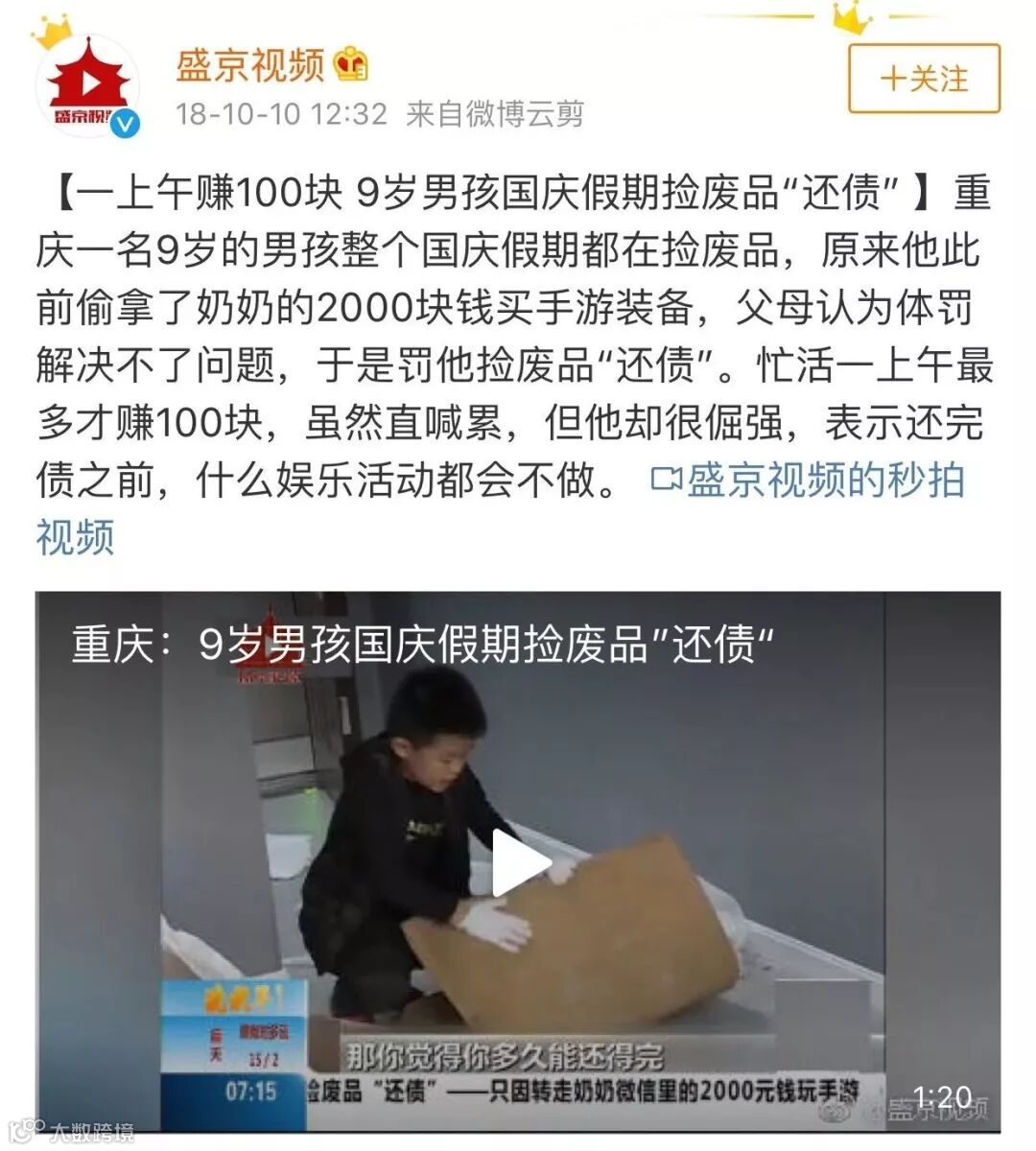 重庆一9岁男孩,偷拿了奶奶2000块钱买手游装备,父母发现后,没有选择体罚,而是罚他捡废品「还债」。