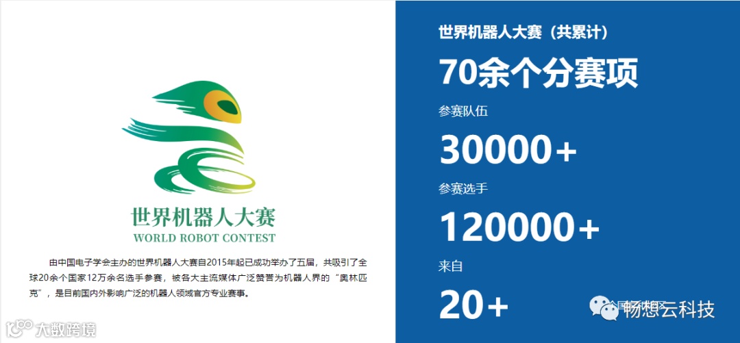 由中国电子学会主办的世界机器人大赛自2015年起,已成功举办了五届,共吸引了全球20余个国家12万余名选手参赛,被各大主流媒体广泛赞誉为机器人界的“奥林匹克”,是目前国内外影响广泛的机器人领域官方专业赛事。