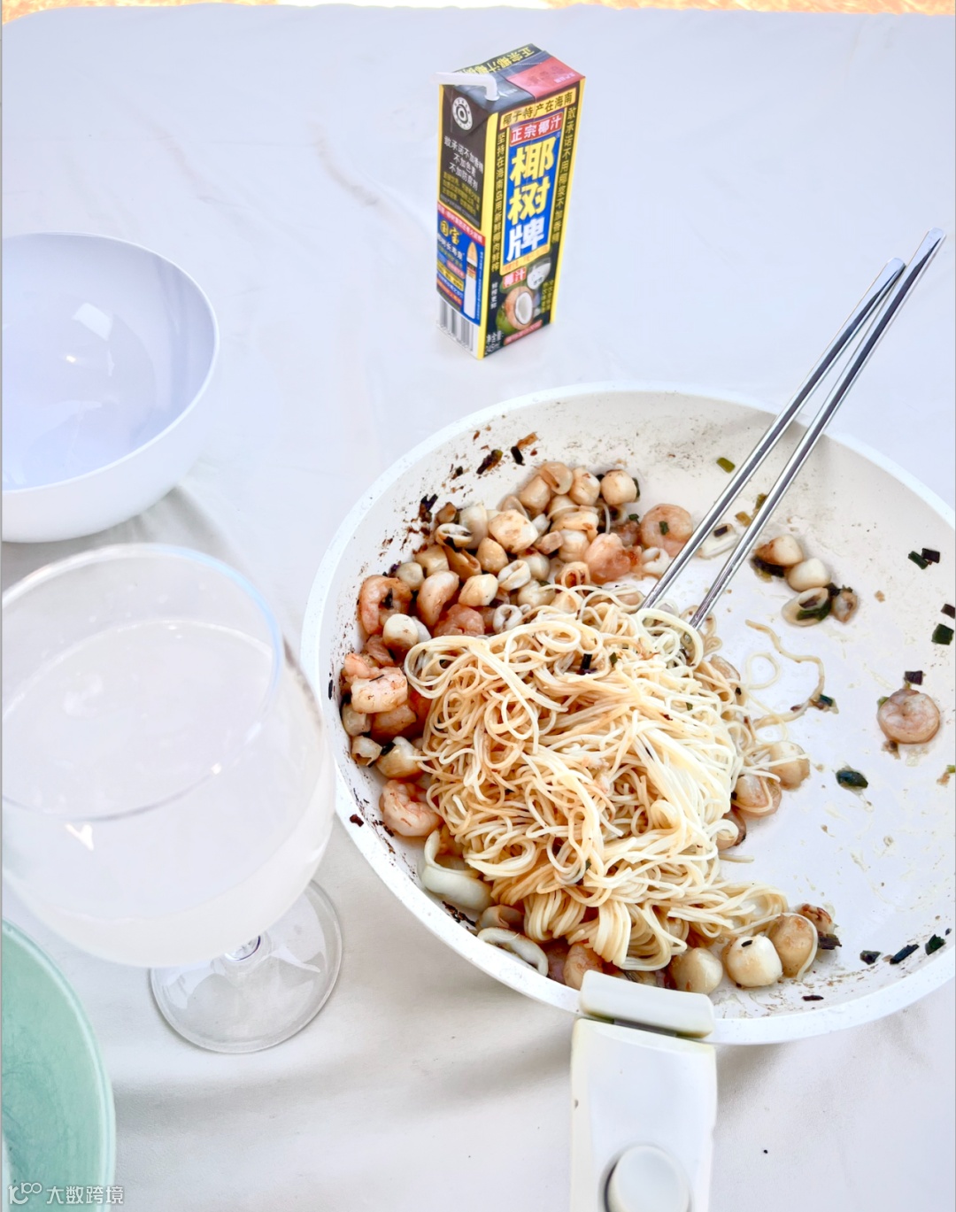 今天,当正午的阳光把后院的黄土照得发亮,我们就在这样的黄土上,展开了野餐垫,铺上了桌子。我做了一份“海鲜葱油拌面”,放到了简易的折叠桌上。开了一瓶椰汁和一盒椰奶,开吃!脚下踩着暖暖的野餐垫,能感受到底下的土的起伏,野草正在努力生长。但那又有什么关系呢,至少这一刻,我是实实在在享受到了阳光和土地带给我的平静。