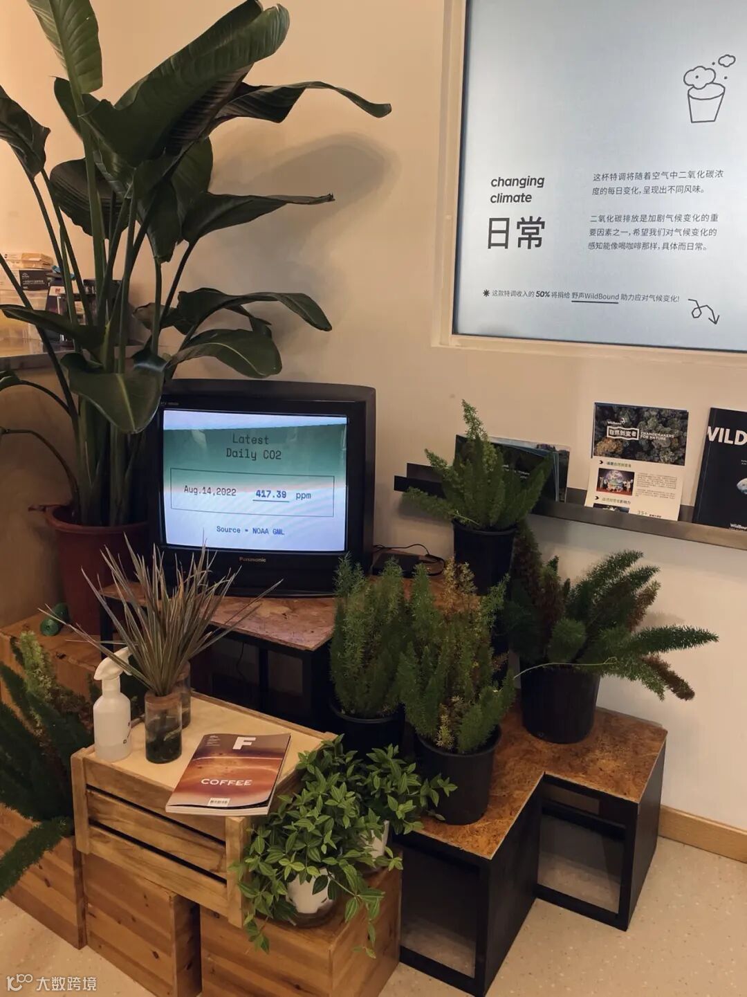 吧台旁边有一个电视,上面会显示前一天全球的二氧化碳浓度。咖啡师会根据这个浓度去做这一期的咖啡特调。它名叫“日常”,因为全球变暖这个议题已经长久存在在大家脑中了。这款特调的收入的一半,会给我们的好朋友,野声WildBound——一个国内的环保可持续方面的机构。接下来的每一款特调,我们都希望能够带出一个命题,同时向大家介绍该领域的一个小而美的组织。