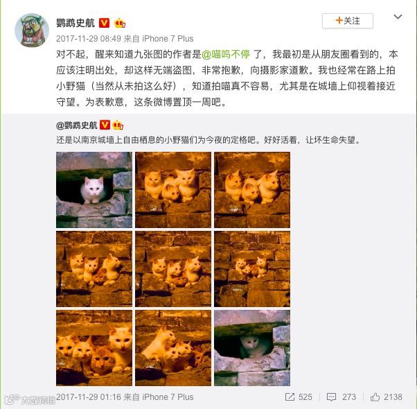 所以他拍出了双猫飞跃屋顶的瞬间,找到了市井罕见的单瞳异色猫,甚至还捕捉到了猫咪尿尿标记地盘的水柱。他每天都有新图晒出,账号“喵呜不停”在社交平台上累积了十几万粉丝,鹦鹉史航曾经盗图又在喵呜粉丝提醒下道歉。