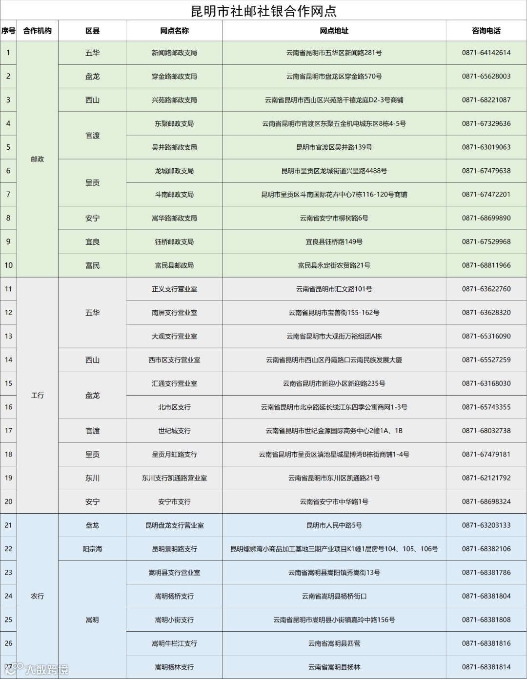 为全力打造“城市一刻钟,农村社区全覆盖”的社保便民服务圈,昆明市社会保险中心与中国邮政集团、中国银行、工商银行、建设银行、农业银行、农信社等金融机构启动实施“社邮”“社银”合作,开通了参保证明查询打印、参保登记、信息变更、待遇资格认证等48项社保业务,开通“社邮社银”合作网点356个,其中:甲类(人工代办)网点46个,乙类网点(自助服务)310个,推动社保经办从“集中办”向“就近办”和“多点办”转变。现将第一批社邮、社银服务网点及服务事项公布如下: