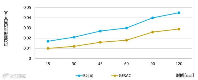 对比在相同工况下加工120min后的刀具后刀面磨损,金鹭刀具磨损为0.027mm,而B公司刀具磨损达到0.049mm,在金鹭全新一代高硬钢涂层性能加持下,金鹭刀具性能优于B公司同类产品一倍以上。