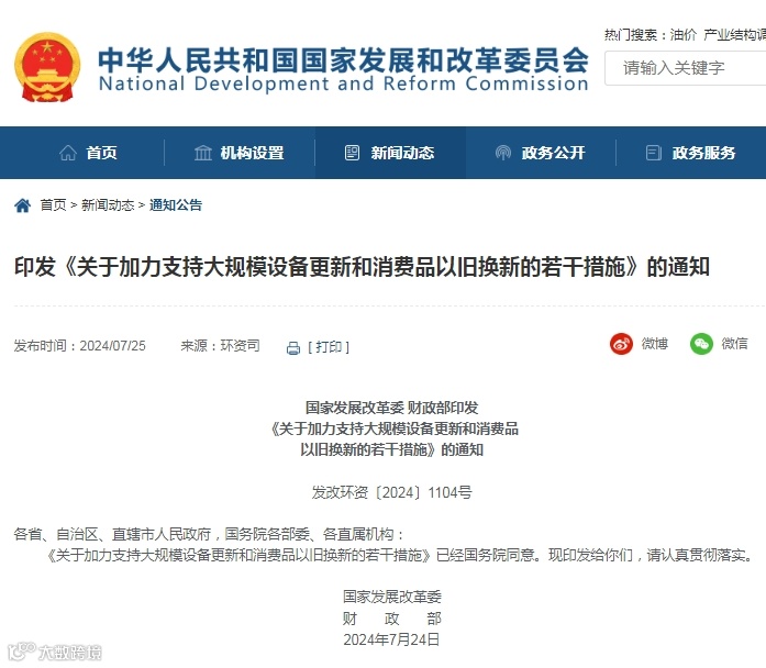 国家发展改革委 财政部印发《关于加力支持大规模设备更新和消费品以旧换新的若干措施》的通知