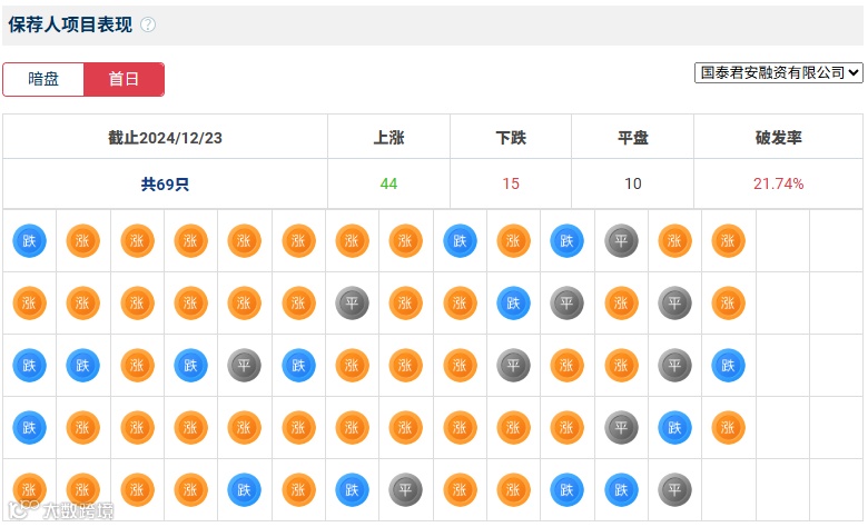 国泰君安历史上作为保荐人共参与了69个项目,暗盘39家公司上涨,10家公司下跌,20家公司平盘,破发率14.49%;上市首日44家公司上涨,15家公司下跌,10家公司平盘,破发率21.74%。