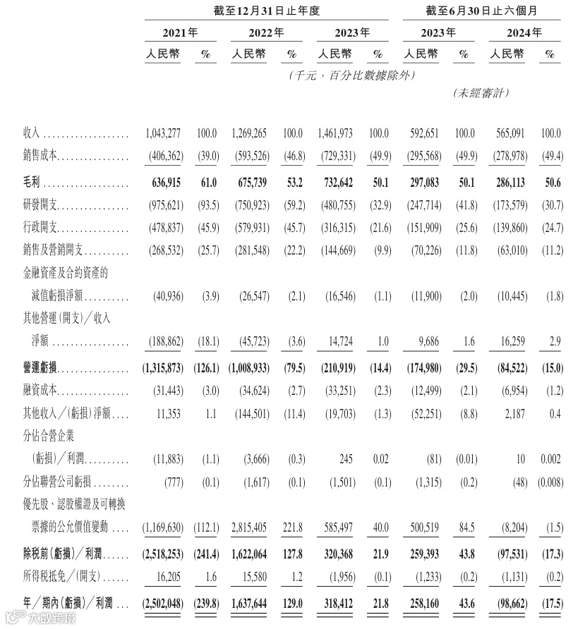 公司研发开支逐年下降,占营收比由2021年的93.5%减少至2023年的32.9%,并在2024上半年进一步减少至30.7%。招股书中解释称由于在2022下半年,公司基于对过往业务表现、财务数据及不断变化的市场情况的综合分析,主动决定精简运营,以优化现金流并确保可持续增长。并且在2023年开始,公司按照在研发资源分配过程中投资回报的优先顺序实施了人员优化,开始减少对技术水平较低的人员投资,显著提高了研发效率,并能够将研发资源集中于更复杂及高价值的任务。