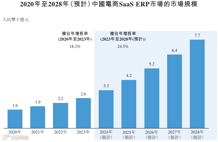 其中,电商SaaS ERP市场在过去数年迅速扩张。根据灼识咨询的数据,中国电商SaaS ERP市场规模(按商家支出计)从2020年的人民币16亿元增长至2023年的人民币26亿元,复合年增长率为18.2%,预计2028年将进一步增长至人民币77亿元,是2023年的三倍。