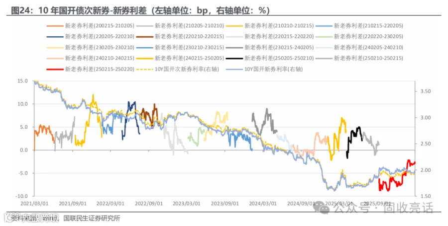 10年国开方面,目前250220-250215利差在3BP左右,当前250220已经切换至主力券,虽然26年的10年国开有可能会开始不断发行,但预计250220会维持一段时间的主力券(一般新券会在1-2个月左右成为下一个主力券),因此250220-250215利差相对合理,可以略微偏向250220。另外考虑到10年国开老券和非国开债与250215利差较低,因此当前10年证金建议继续重点关注活跃的250215和250220。