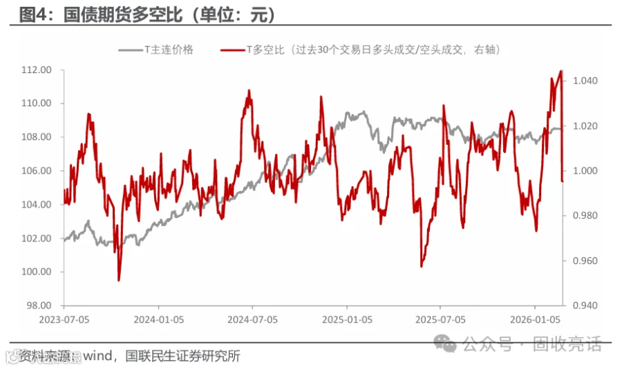 从国债期货投资者看法的角度,我们构建了国债期货多空比指标(多头成交量/空头成交量)。近期10年国债期货高位调整,多空比也从历史高位跟随下行,此前多头力量聚集较多的风险有所缓解。