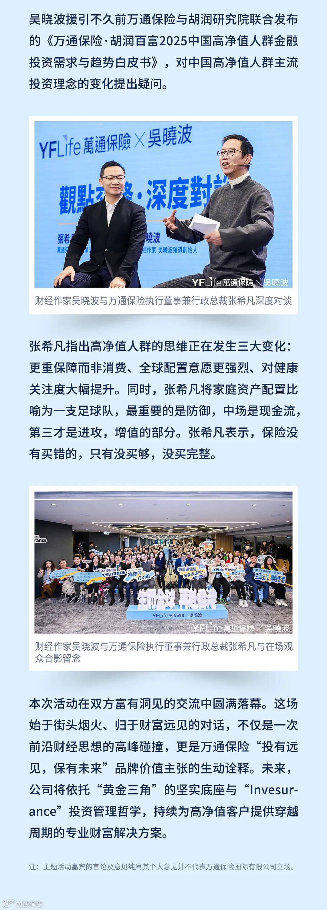 万通保险国际有限公司明确表明概不因他人使用或诠释以上之任何资料而承担任何责任。有关释义及完整的条款及细则的详情,请参阅保单文件样本。如上述有关产品资料及其内容与保单文件内容不符,则以保单文件为准。有关法律声明及使用条款,请参阅[https://www.yflife.com/sc/Hong-Kong/Legal-Notice]。