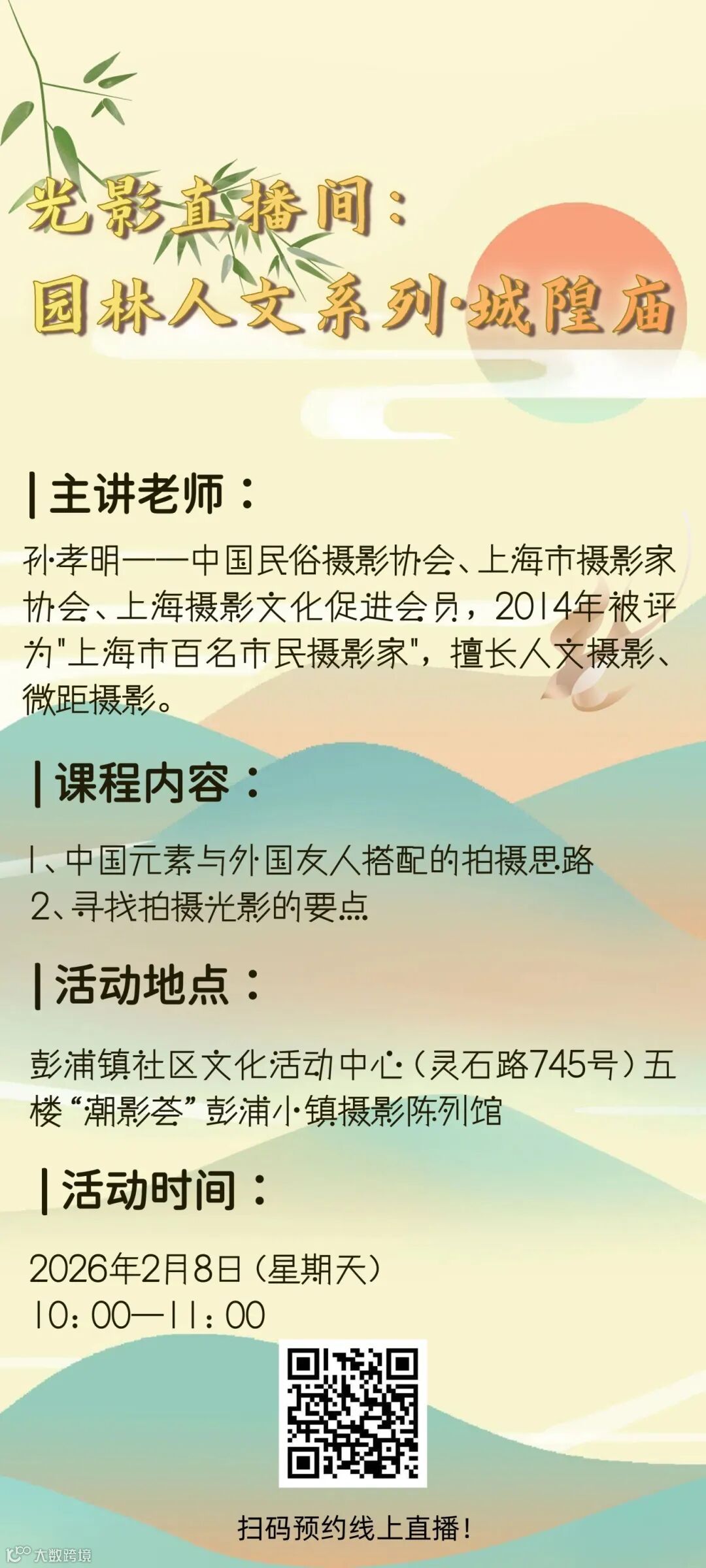 本期《园林人文系列·城隍庙》将以兼具传统底蕴与市井烟火气的城隍庙为创作舞台,开启一场融合东方美学与多元视角的影像探索。讲师将带领你深入这座承载历史记忆与生活气息的文化空间,解析如何巧妙构图,让中国元素与外国友人同框,在文化交融中碰撞出别具张力的画面;同时,还将分享在园林环境中捕捉光影的关键技巧——教你于亭台楼阁之间,敏锐捕捉明暗交错的层次,以光影勾勒建筑细节、烘托人文氛围。无论你是初涉人文摄影的新手,还是希望突破创作瓶颈的进阶爱好者,这堂课都将为你打开园林人文摄影的新思路,助你精准定格中式景致的独特韵味与精神内核。