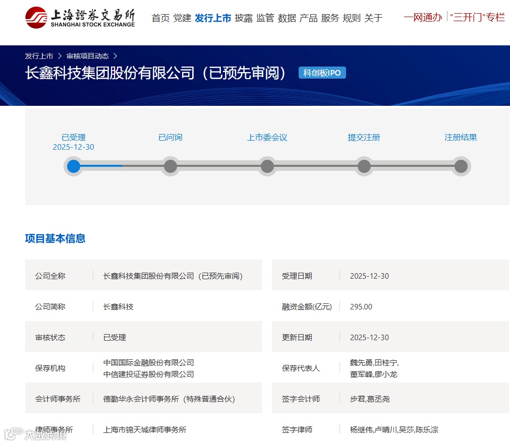 上交所官网12月30日晚间显示,长鑫科技集团股份有限公司(下称“长鑫科技”)申报科创板IPO获交易所受理。