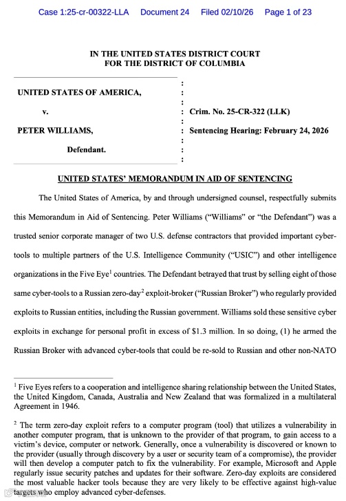 美国司法部已正式发布量刑备忘录,明确将Williams的行为定性为严重背叛——既背叛了其雇主L3Harris与Trenchant,更背叛了美国政府,其行为已对美国国家安全造成不可挽回的重大损害。备忘录中特别指出,Williams的泄密行为,相当于为俄罗斯掮客提供了“致命武器”,让这些掮客能够向其客户交付强大的网络攻击工具,进而威胁全球各类目标的安全。