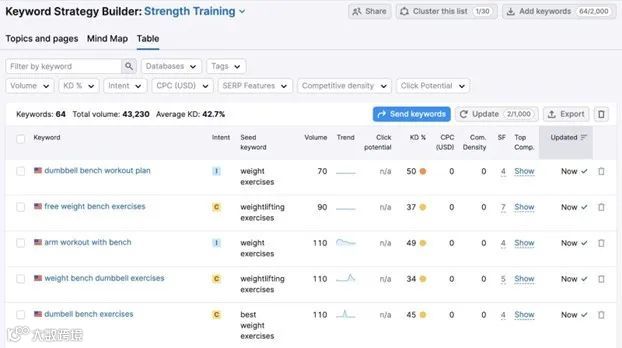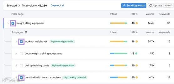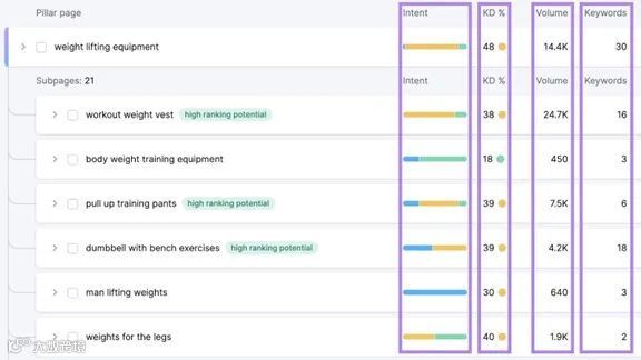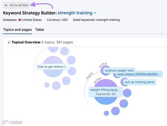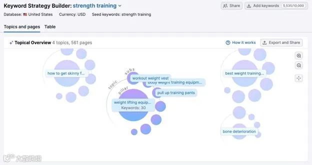 我们可以为网站创建多个支柱页面,而每个支柱页面都会有多个子主题。推荐使用Semrush的Keyword Strategy Builder来组织所有内容。