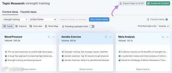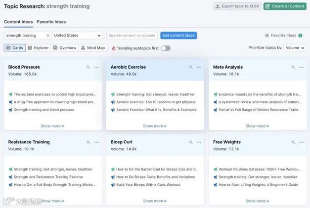 Semrush就会基于该主题生成一份报告。在这里,您将能够看到与该核心主题相关的子主题列表。