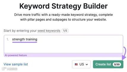 首先输入一个或多个代表网站核心主题的种子关键词,然后点击Create list。