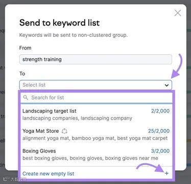 接下来,从下拉框中选择要添加关键词的关键司列表,或者点击Create new empty list来创建新列表。