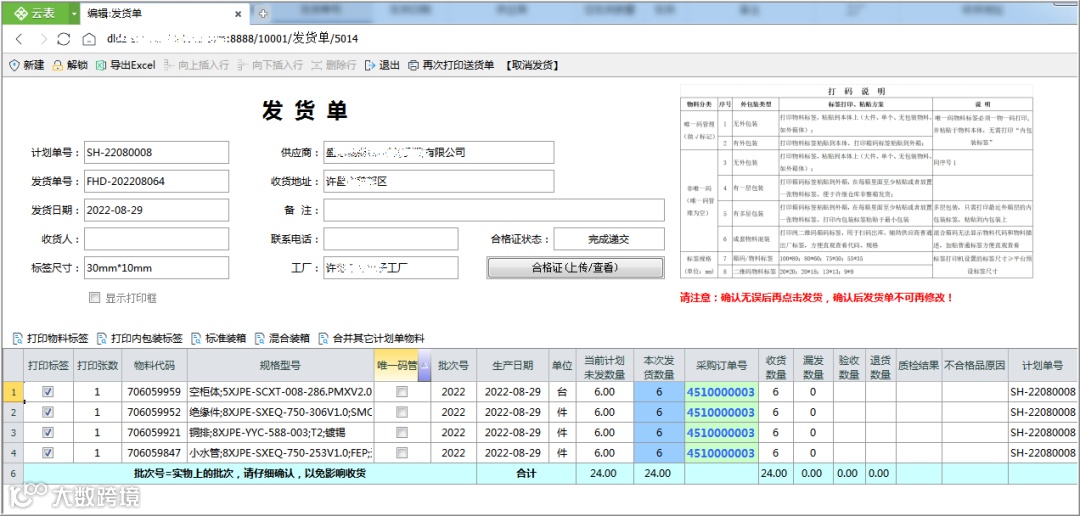 供应商根据交货计划安排备货生产,SRM平台为供应商提供标签、条码、二维码的在线打印功能。