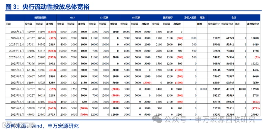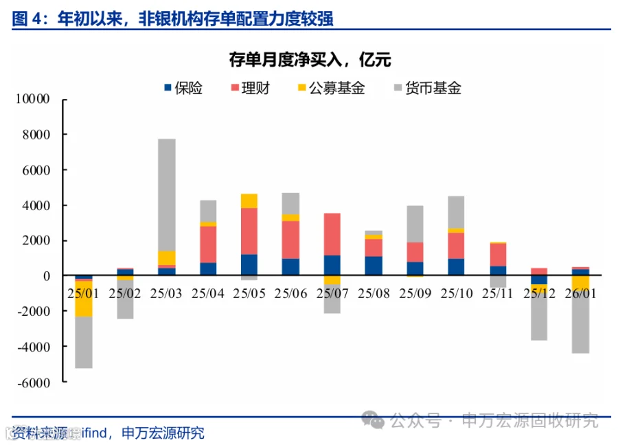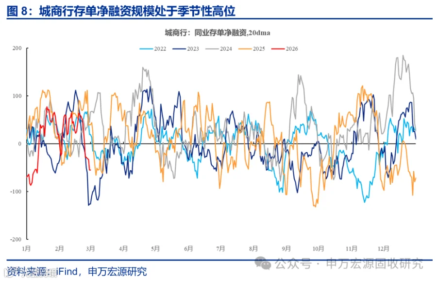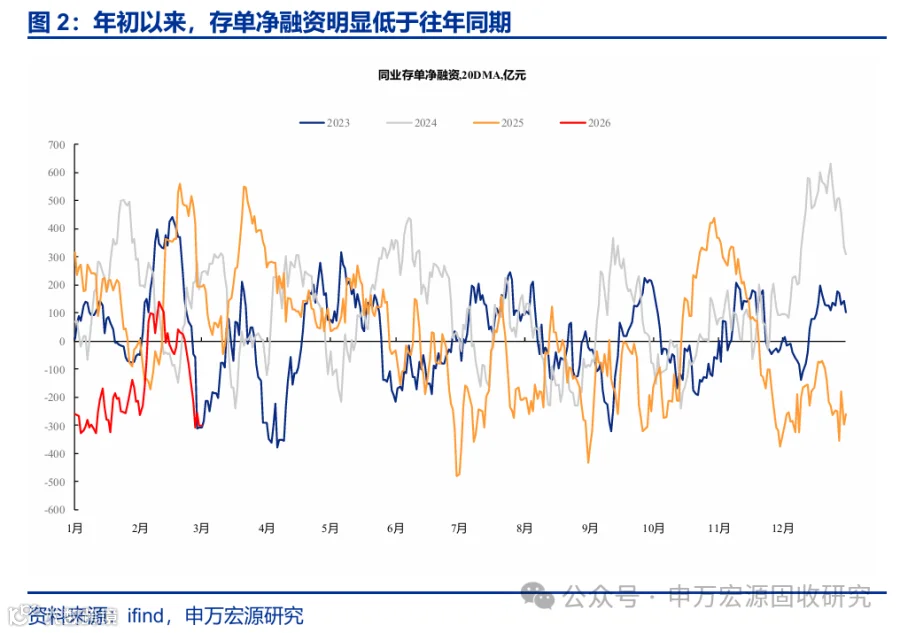 供给端来看,央行投放了较多相对中长期的流动性,银行存单净融资规模明显低于往年同期。实际上,自2025年四季度开始,央行流动性投放力度就明显增强,并且通过MLF、买断式逆回购等工具投放了较多相对中长期的流动性,同时恢复了常态化买债操作,但对银行负债端补充效果也较为明显。从存单发行来看,年初以来银行存单净融资也明显低于往年同期水平。