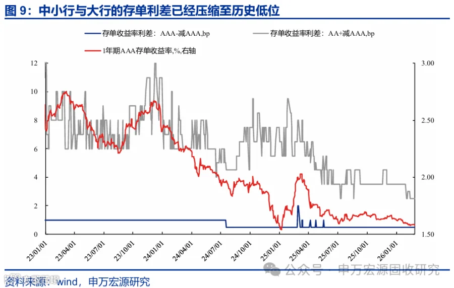 存单呈现结构分化,中小行存单利率的下行难度可能相对更大。从央行流动性投放的传导链条来看,中小行本就处于中下游,获取成本相对更高。从存单需求来看,大行存单评级更高,需求更加充裕,但中小行存单可能会受制于评级约束,需求面临一定瓶颈。此外,随着监管更加规范,未设立理财公司的中小银行或将在2026年底清理理财业务,而中小行资管本是信用下沉的重要机构,这意味着后续中小行的存单需求或也将面临收缩,进一步制约中小行存单利率下行。