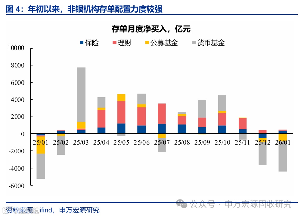 供需均较为友好,支撑存单利率平稳。2026年以来,尽管资金面面临了一些扰动,包括税期、跨节等因素,但存单利率走势总体平稳,从供给端和需求端来看,对存单利率都较为友好。