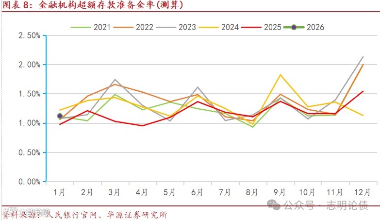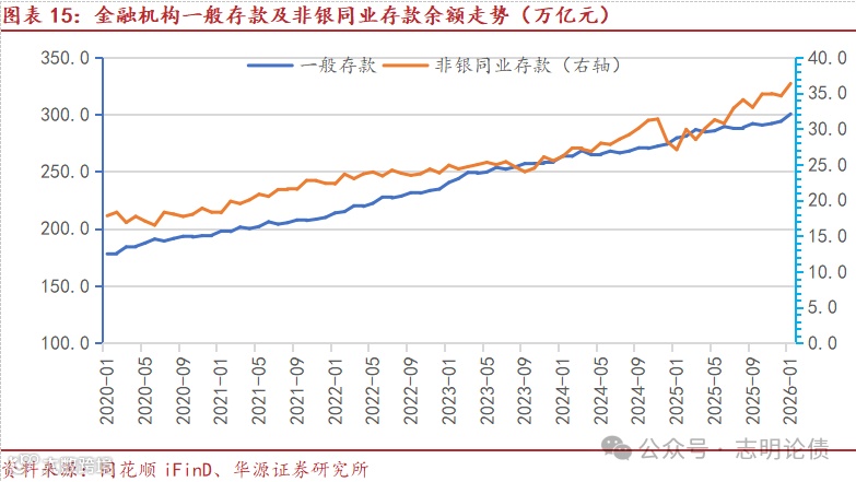 存款利率较低并未对存款增长造成明显的影响,股市活跃对银行总负债的影响很小。2022年以来,存款利率多次大幅下调,但个人定期存款余额稳步增长,从2021年12月末的68.2万亿增长至2026年1月末的123.8万亿。2022年底理财负反馈,个人投资者赎回理财,使得2022年11月、12月及2023年1月个人定期存款同比显著多增。2023年1月存的3Y定期存款已于2026年1月到期,但今年1月份个人定期存款余额依然增加了2.02万亿,反映存量定期存款到期大部分续存,且2026年春节较晚,春节前企业发年终奖预计将带动2月个人定期存款大幅增长。2025年5月定期存款利率大幅下调使得2025年6-8月个人定期存款同比明显少增,但该影响已明显减弱,2025年11月及12月个人定期存款已同比多增。股市活跃,若老百姓将资金转入股票账户,个人存款转化为同业存款,并未影响银行体系的总负债,只是改变了负债形式。倘若股民卖出股票并将资金从股票账户转出,则会增加个人存款。倘若股民转入资金参与股票IPO,那么,个人存款转化为企业存款。此外,个人投资者买银行理财等资管产品也不会减少银行体系的总负债。例如,个人买理财,个人存款减少,但理财拿到资金可能存在银行,增加非银同业存款;也可能投资企业新发债券,则企业存款增加;还可能二级买入债券,则另外一家机构的存款增加。