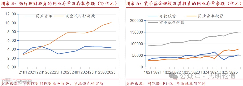 近几年同业存单投资者结构发生变化,同业存单的需求以银行理财及货币基金等广义基金为主。截至2025年12月末,政策性银行持有同业存单0.44万亿,占比2.2%,较2020年末下降4.2个百分点;存款类金融机构持有同业存单4.72万亿,占比24.0%,较2020年末下降12.4个百分点;非法人产品持有12.53万亿,占比63.7%,较2020年末上升14.4个百分点。截至2025年末,理财持有4.35万亿同业存单,货币基金持有7.61万亿。由此可见,同业存单的投资需求以银行理财及货币基金等广义基金为主。2025年理财投资的同业存单规模未增长,但货币基金的同业存单投资余额大幅增长。