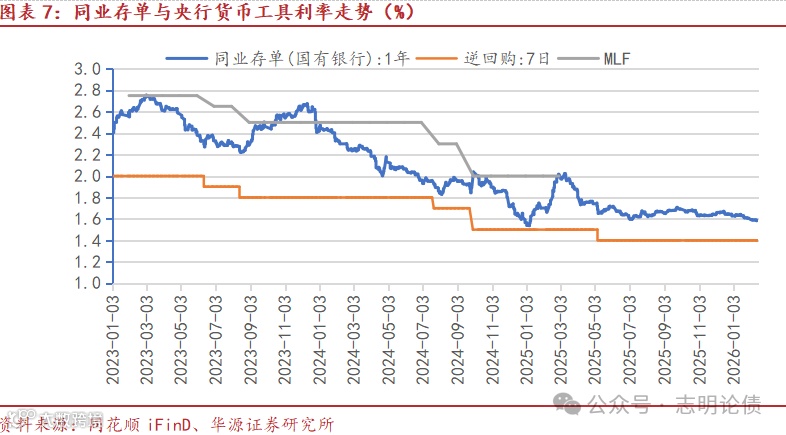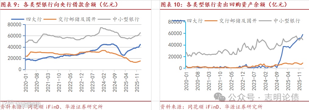 2025年下半年以来大行同业存单余额明显下降,或与央行加大流动性投放及一般存款增速回升等有关。25Q2以来,四大行一般存款增速有所回升,从2025年3月末的3.7%回升至2026年1月末的7.6%,缓解了大行的负债压力。此外,2025年下半年以来,央行加大了中长期流动性投放,通过买断式逆回购及MLF等维持流动性充裕。截至2026年1月末,央行对其他存款性公司债权余额21.69万亿,较2025年5月末增加了4.55万亿。我们预计四大行为参与央行买断式逆回购主力,2025年5月末-2026年1月末央行合计通过买断式逆回购投放流动性2.4万亿,同时期,四大行卖出回购余额从3.48万亿增长至5.79万亿。此外,四大行的向央行借款(包括MLF、再贷款再贴现等)余额从2025年5月末的3.24万亿增长至2026年1月末的4.45万亿。买断式逆回购及MLF等成本较低,大行通过买断式逆回购及MLF获得了较多的资金,显著降低了其对同业存单的发行需求。此外,理财偏好投资存款(存款成本法估值利于降低产品净值波动)及股市活跃带来非银同业存款增长,也可能降低部分银行的同业存单发行需求。由于地方银行大多没有股票账户的第三方存管资格,股市活跃增加全国性银行非银同业存款,可能降低全国性银行的负债压力。