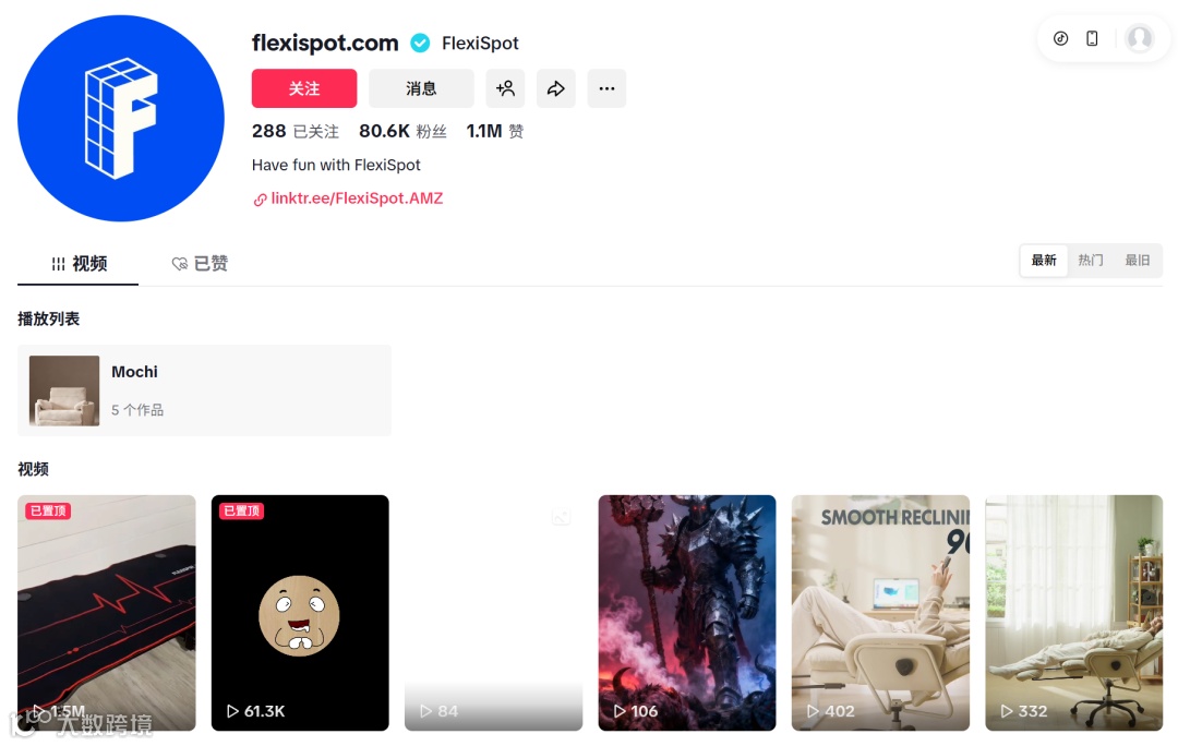 品牌在TikTok布局的官方账号@flexispot.com,目前已积累8.06万粉丝、110万获赞,影响力在所有社媒平台中遥遥领先。