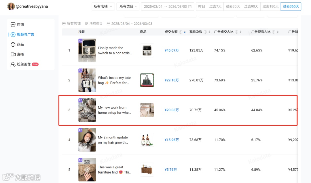 比如仅3418位粉丝的@creativesbyyana,分享的折叠升降桌日常使用视频,只是真实展现产品在日常中的用法,近一年播放量就高达70.72万次,直接带来20.03万美元成交。