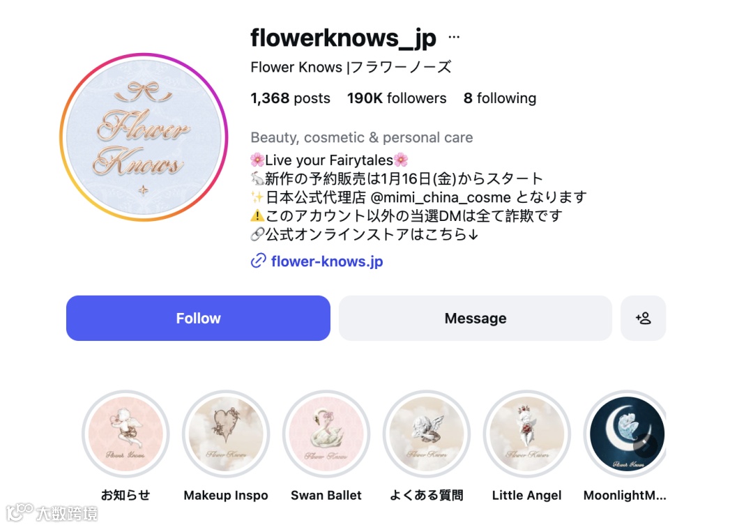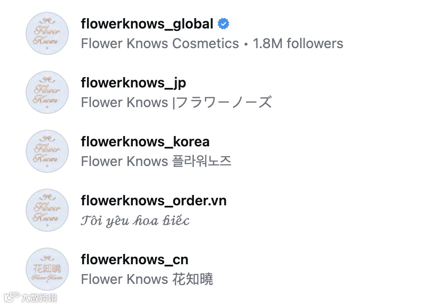 其中 @flowerknows_jp 粉丝量最高,已达190万+,成为品牌在海外市场的重要流量阵地。