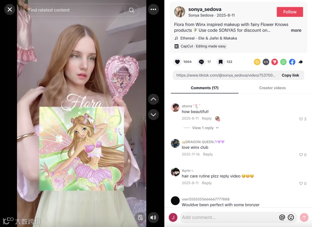 与花知晓的合作中,她以复刻风靡全球的经典少女向动画《Winx Club(魔法俏佳人)》的角色Flora为灵感,全程使用花知晓产品,将二次元角色的灵动与品牌的梦幻设计完美融合。