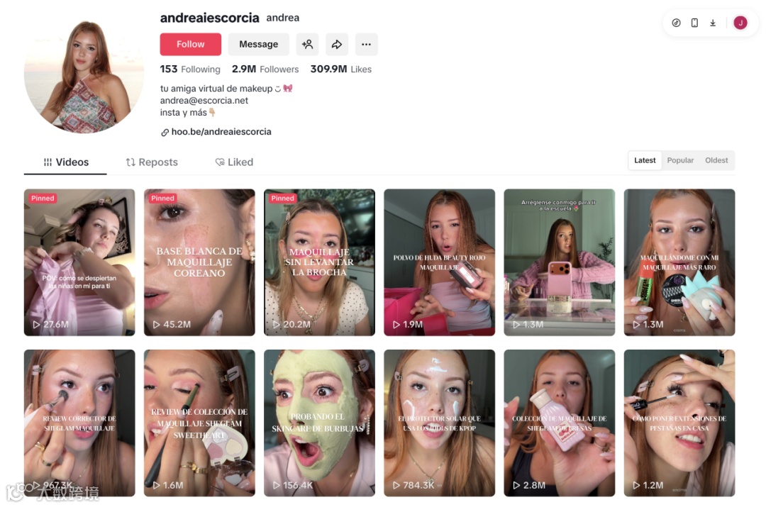 @andreaiescorcia 是来自巴拿马 的西班牙语TikTok头部美妆博主,坐拥280万+粉丝。