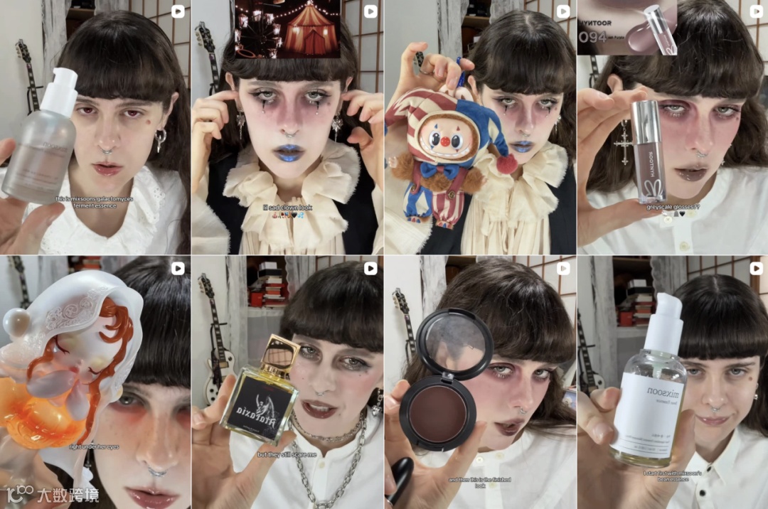 与花知晓合作视频中,她并没有采用传统测评讲解方式,而是围绕花知晓“贝壳珠宝系列”眼影盘,完成了一次完整的角色塑造,呈现出一个“忧郁人鱼风”的哥特形象。