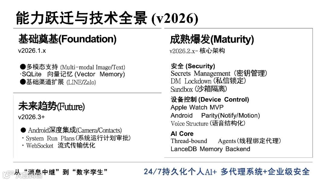 成熟爆发:v2026.2.x-核心架构,安全(Security),Secrets Management(密钥管理),DM Lockdown(私信锁定),Sandbox(沙箱隔离),设备控制(Device Control),Apple Watch MVP,Android Parity(Notify/Motion),Voice Structure(语音结构化),AI Core,Thread-bound Agents(线程绑定代理),LanceDB Memory Backend。